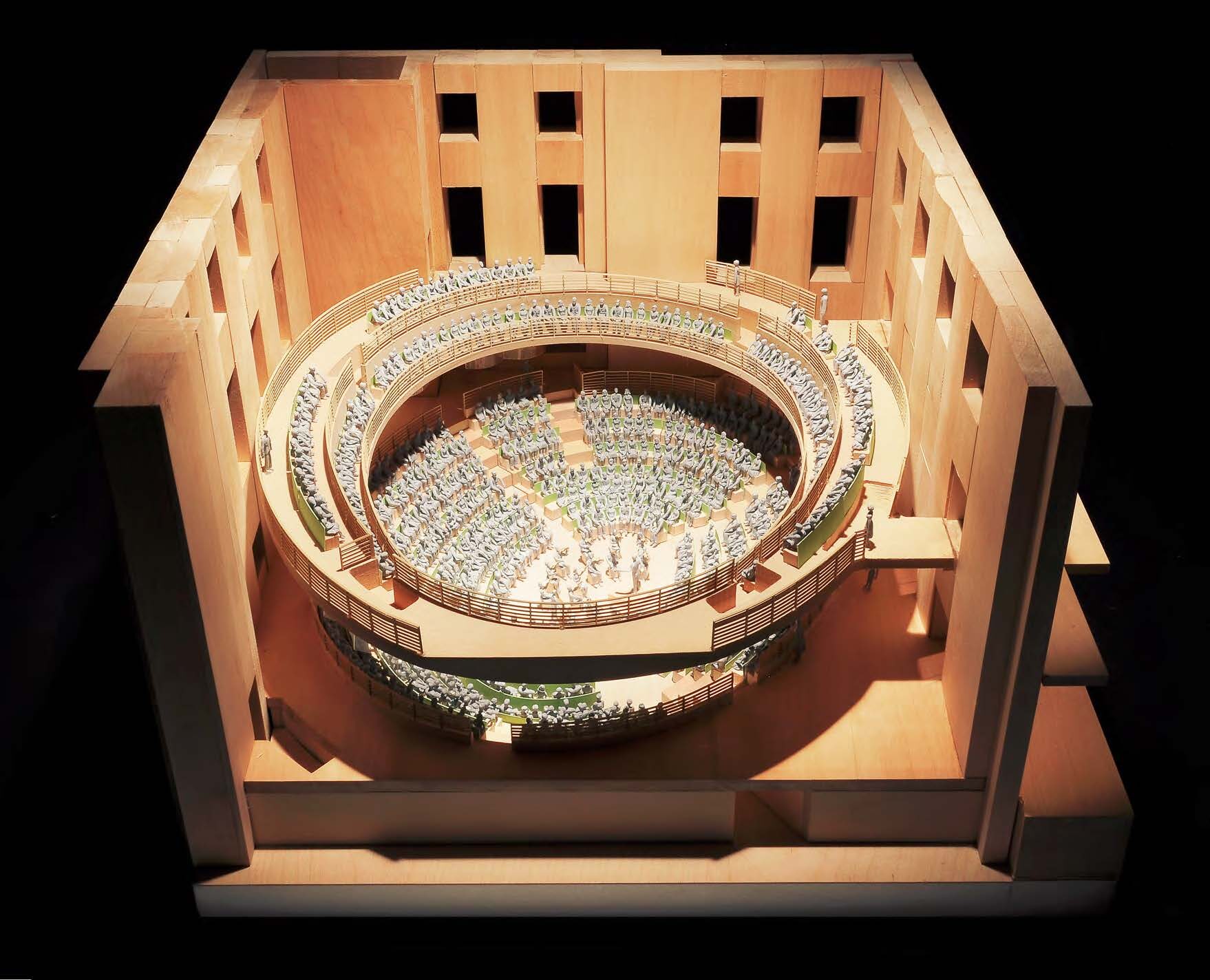 „Ich ging wieder an die Arbeit, schaute mir alle Skizzen genau an und fand einen Weg, wie es ging. Es gibt zwei Ovale, jedes mit seiner eigenen Achse. Sie sind voneinander getrennt, und das obere Oval ist gegenüber der Achse des unteren leicht verschoben, um den Balkon oben zum unteren Teil zu öffnen. Es sieht so aus, als schwebe er im Raum. […] Es wird für mich als Nicht-Musiker etwas ganz Besonderes sein, einen so wichtigen Ort in der Geschichte der Berliner Musik einzunehmen.“
